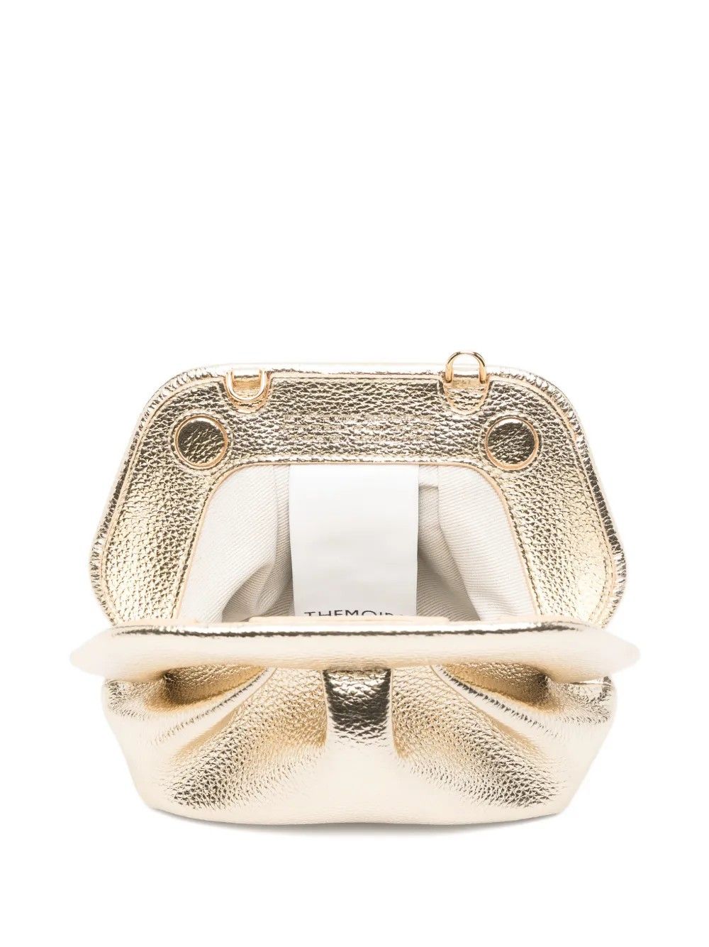 Discover the refinement and sophisticated style of the THEMOIRÈ clutch, a luxury accessory that stands out for its golden metallic texture and high-quality finishes. Made from fine leather, it offers a functional design with a spacious top opening and a removable shoulder strap, perfect for evening events or daily outings.