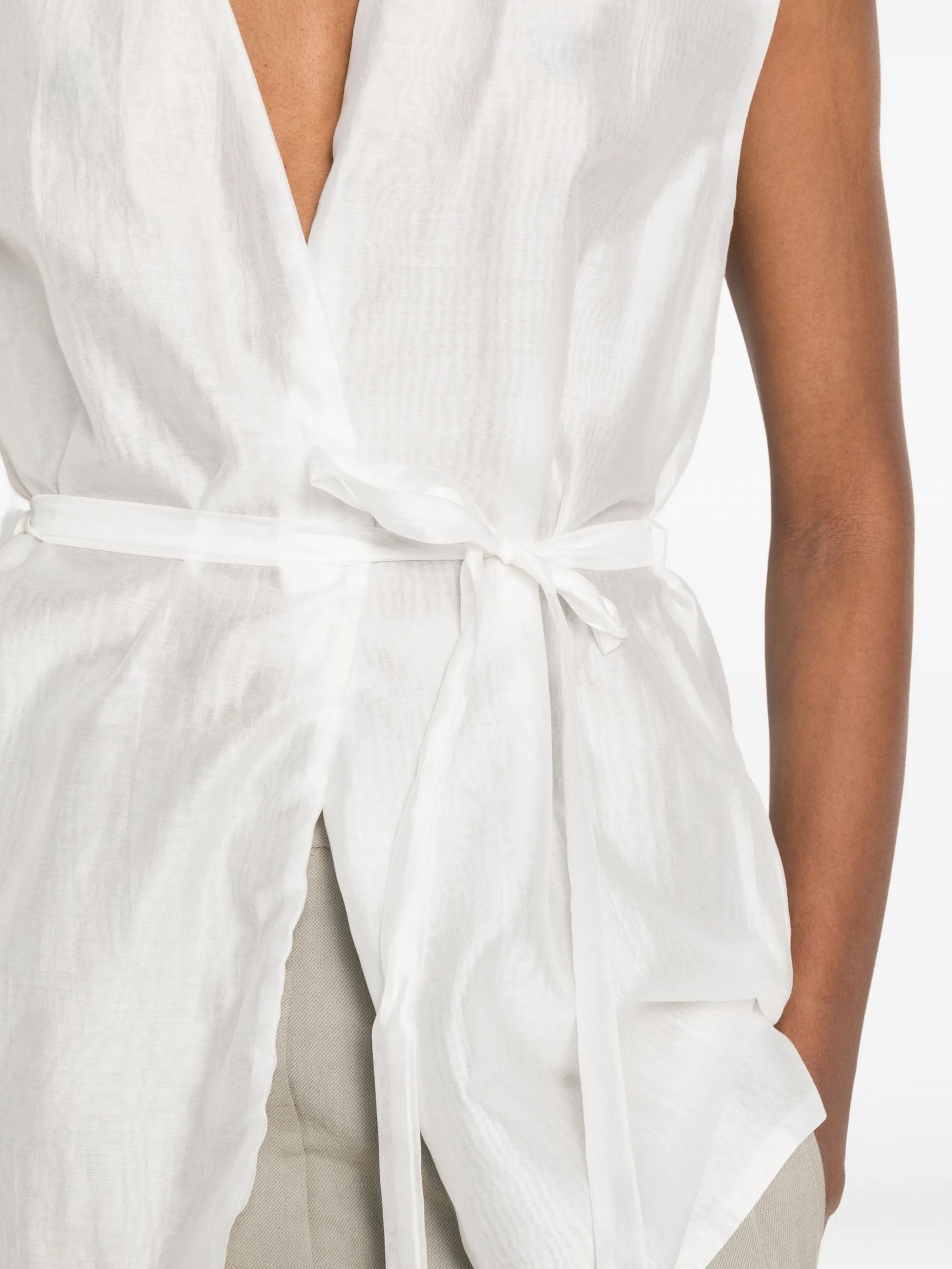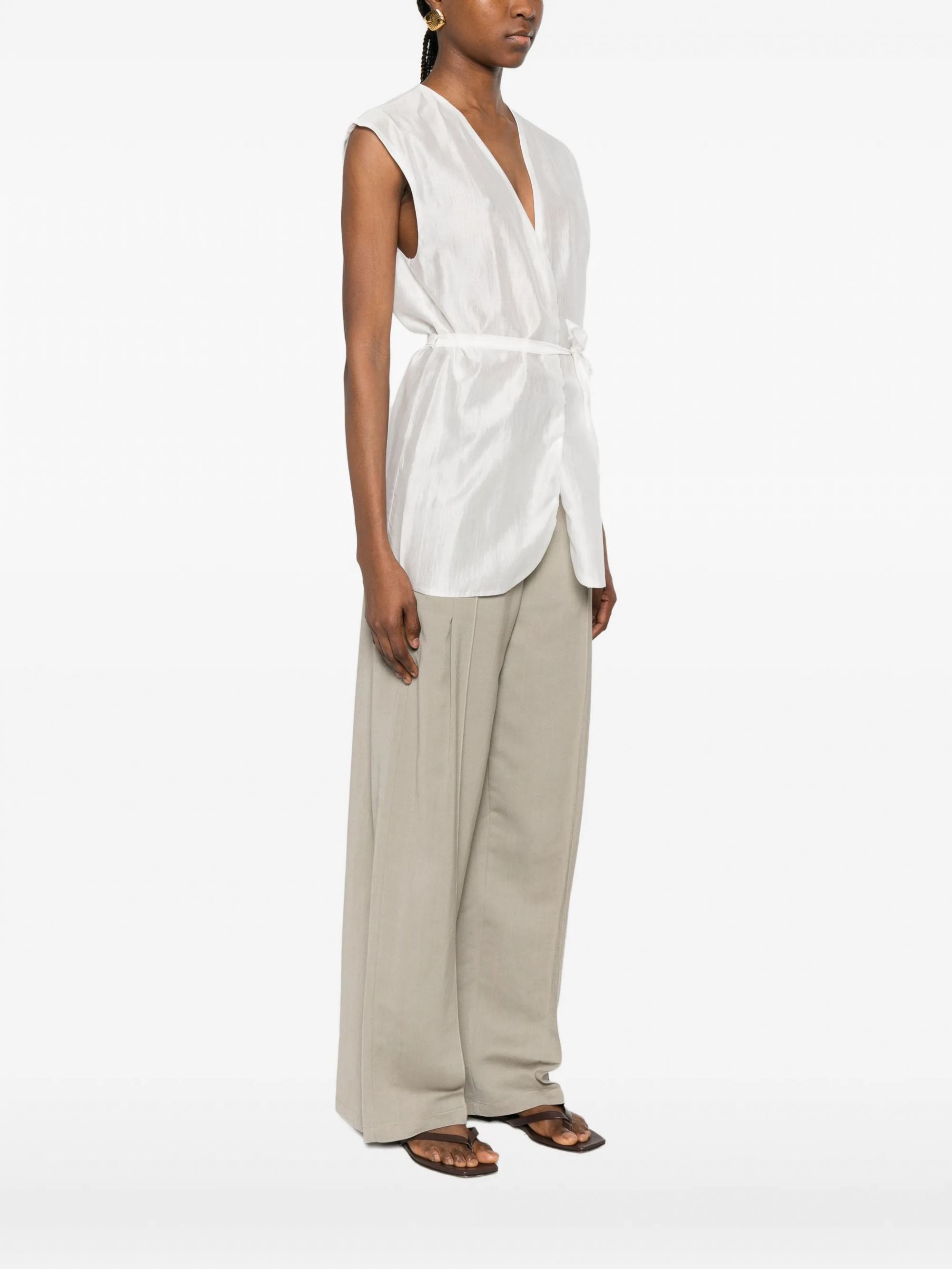Discover the silk vest by BRAND SU, an ideal piece to add a touch of refined elegance to your wardrobe. Made from high-quality materials, this vest features a fluid fit and a waist belt to enhance the silhouette.