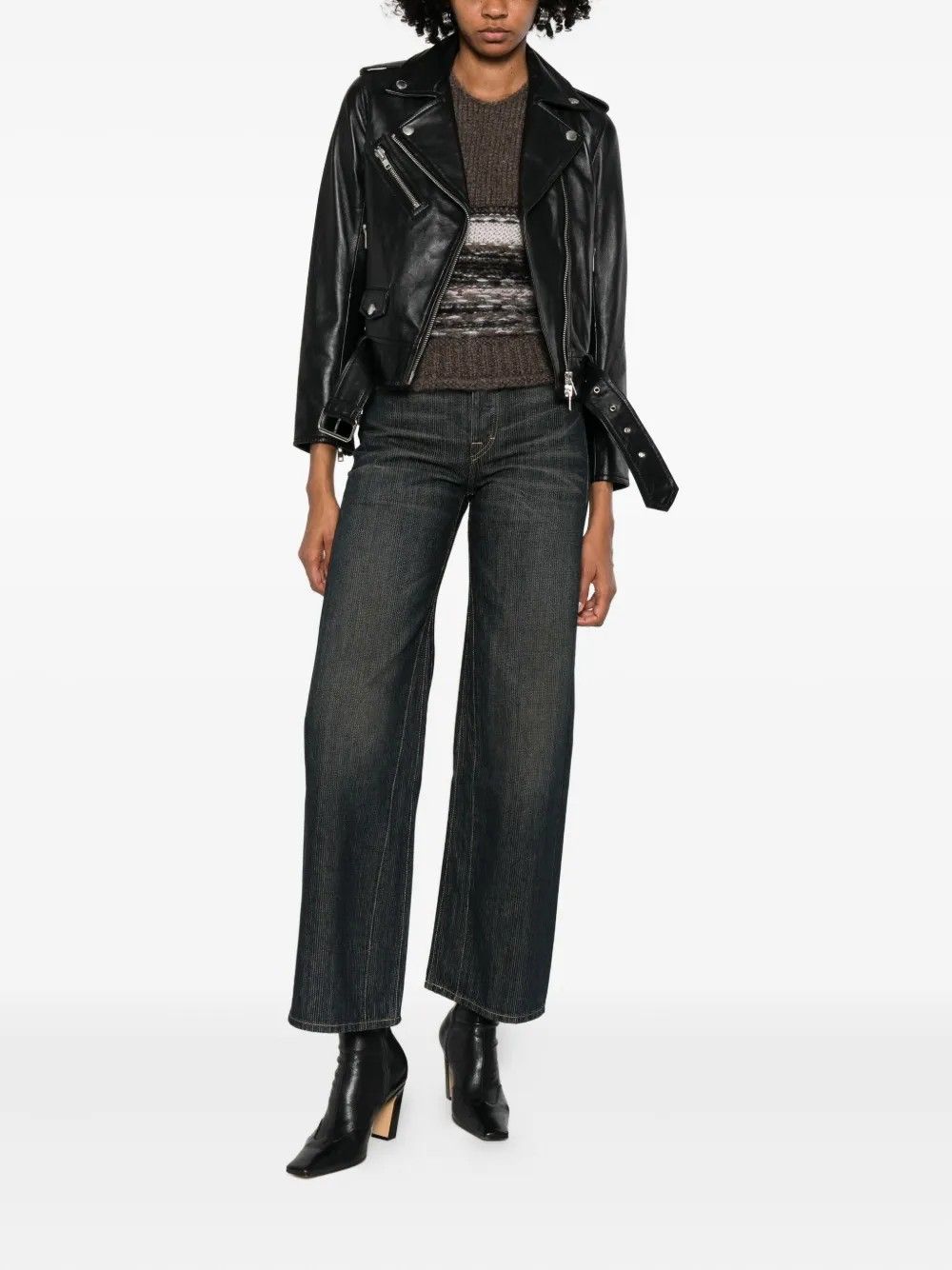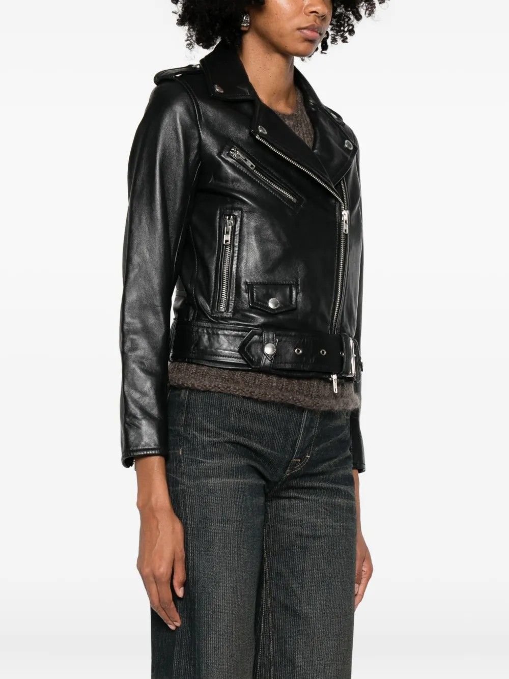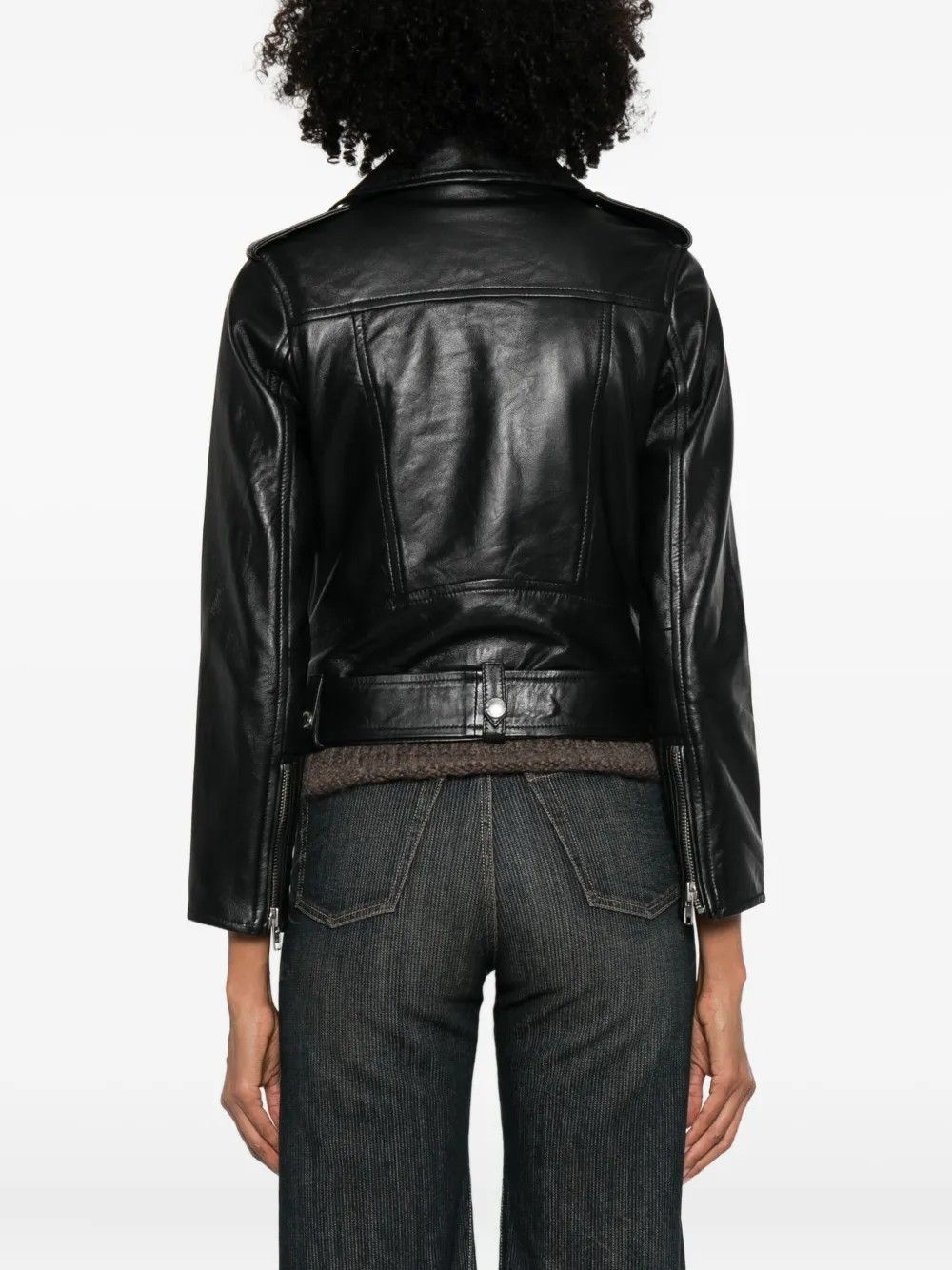 Lambskin biker jacket by Stand Studio featuring a contemporary design with an asymmetric zip closure and a waist belt for a defined silhouette. Equipped with functional pockets, it combines premium materials and refined details for a bold and sophisticated piece. Made of 100% lambskin leather with a polyester and viscose lining.