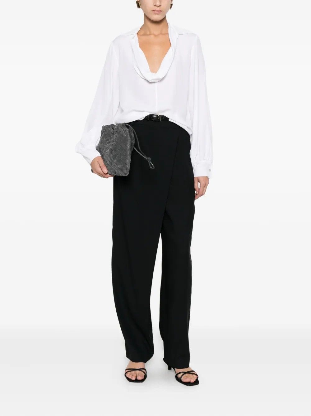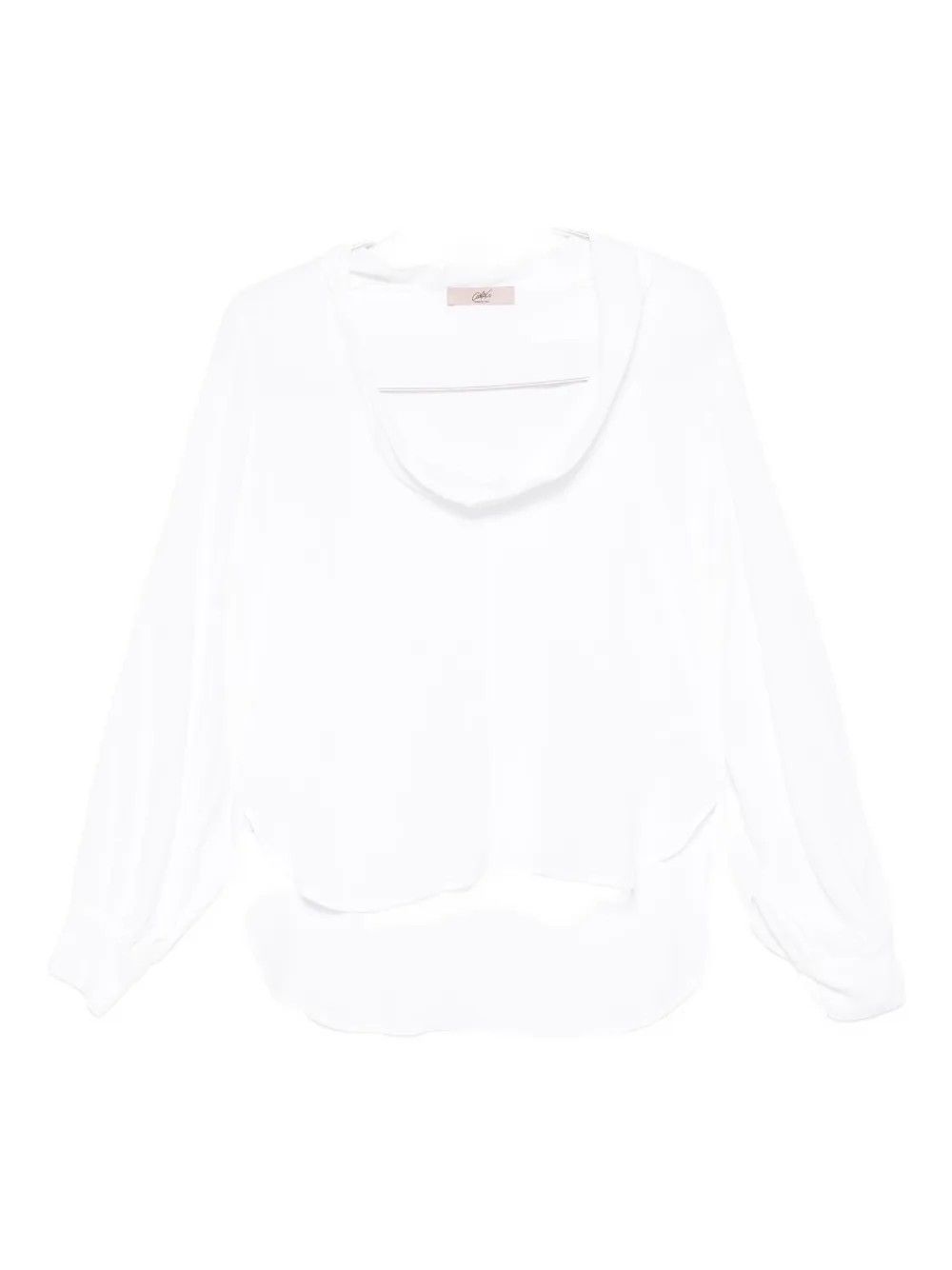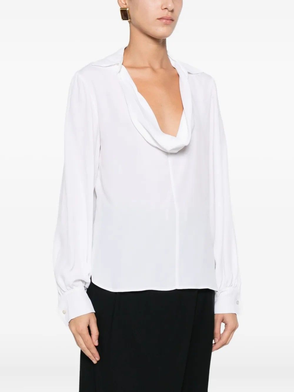 Long-sleeved crepe blouse featuring a double loop collar that can be worn at the front or back for a versatile, refined look.Wide sleeves add fluidity, finished with mother-of-pearl buttoned cuffs.The asymmetric hem, shorter at the front with side slits, enhances the garment’s line.Hip-covering length makes it perfect for elegant or layered outfits.A refined piece blending femininity with modern appeal.