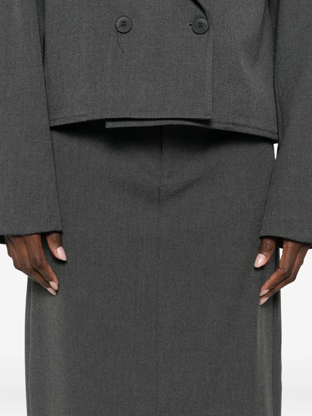 The high-waisted skirt features a straight and clean silhouette enhanced by a front button fastening and belt loops that emphasize its structure.The minimal design highlights the piece’s versatility, perfect for various styling options.The high-rise fit elongates the figure while providing comfort and support.Made from 100% fabric, it ensures quality and durability.A modern and functional addition to the contemporary wardrobe.