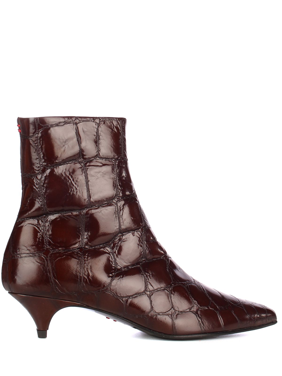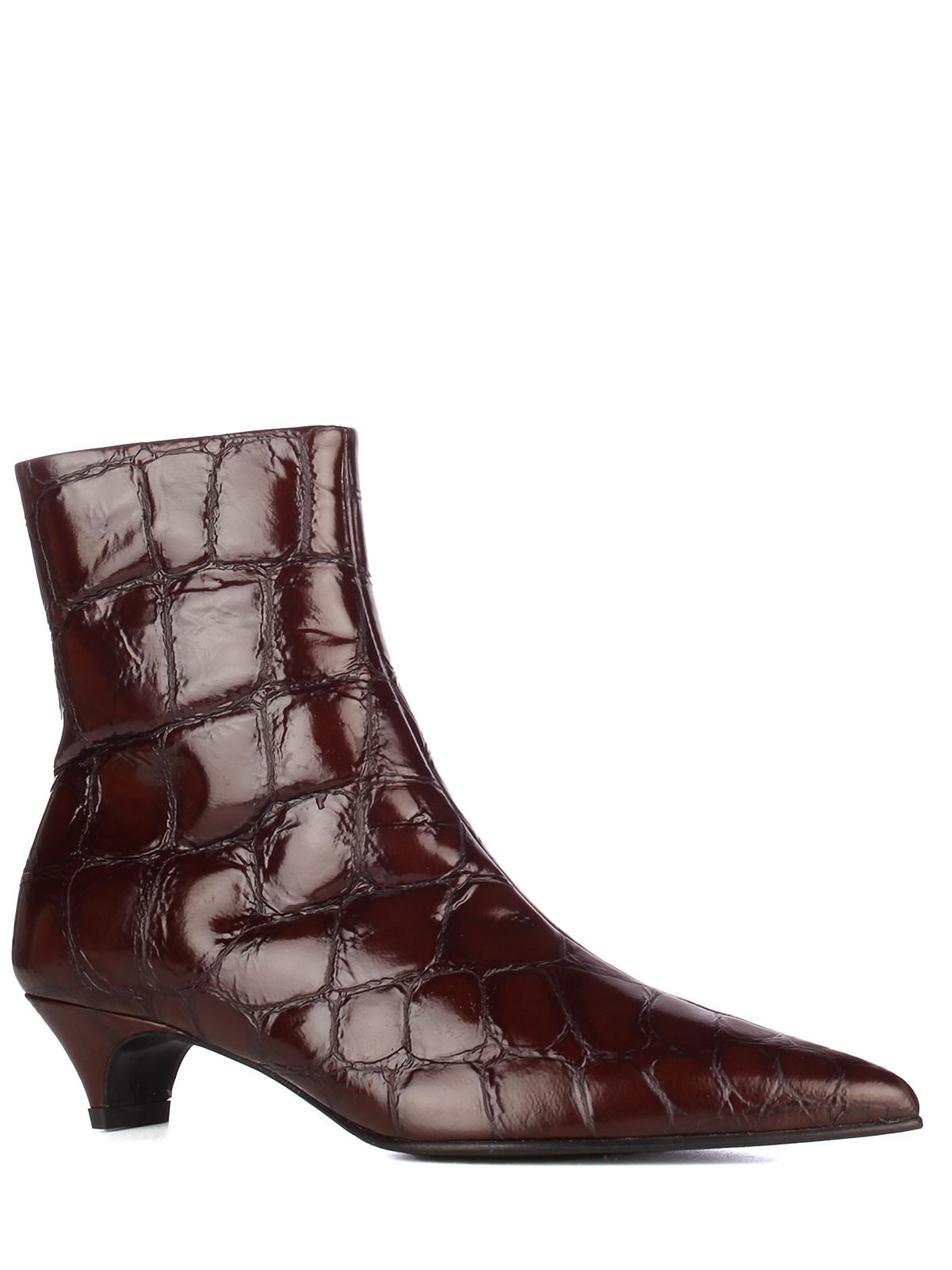 Halmanera Vale boots in calf leather with glossy finish and embossed croc effect.Pointed toe and 60 mm mid heel for bold yet understated elegance.Side zip closure ensures easy and secure fit.Leather lining and branded insole offer refined comfort.Leather and rubber sole designed for stability and durability.Ankle-length silhouette perfect for structured, modern looks.