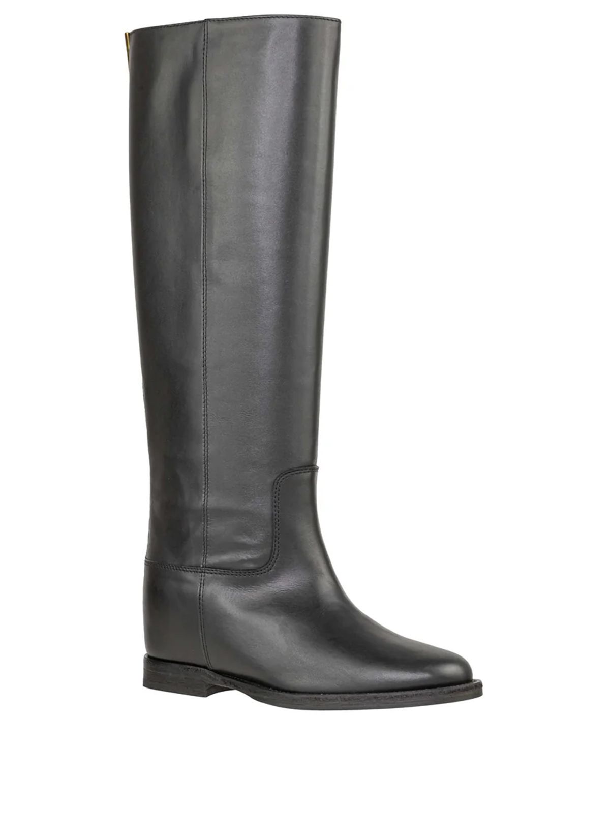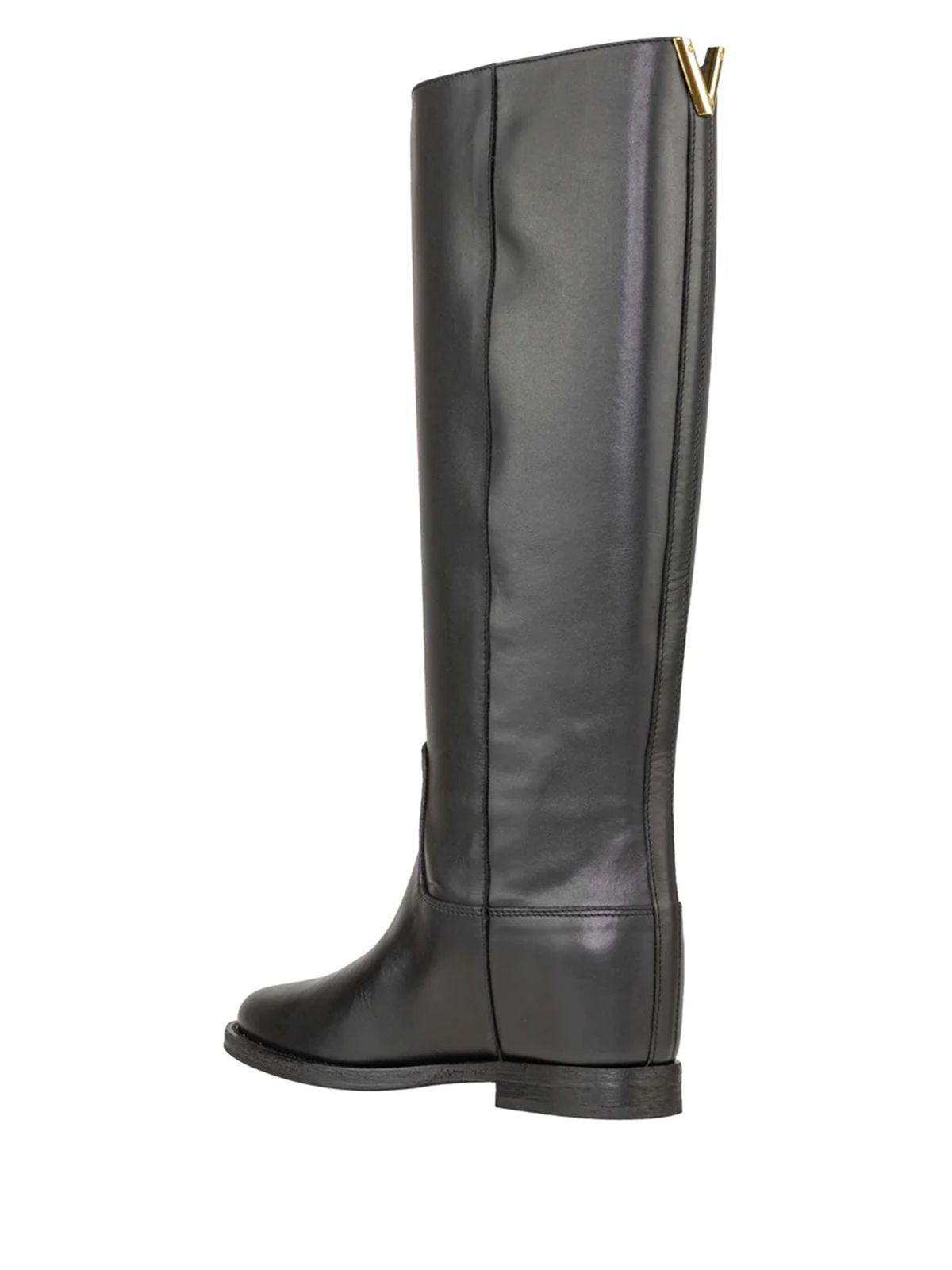 Tube boot handcrafted in soft leather with a tapered toe and clean lines,offering timeless elegance.The 4 cm internal wedge adds subtle lift while ensuring comfort.The 44 cm shaft height enhances the silhouette,while the gold-tone V logo on the back adds a refined signature.The leather and rubber sole ensures grip and durability.Slightly narrow fit.Made in Italy.