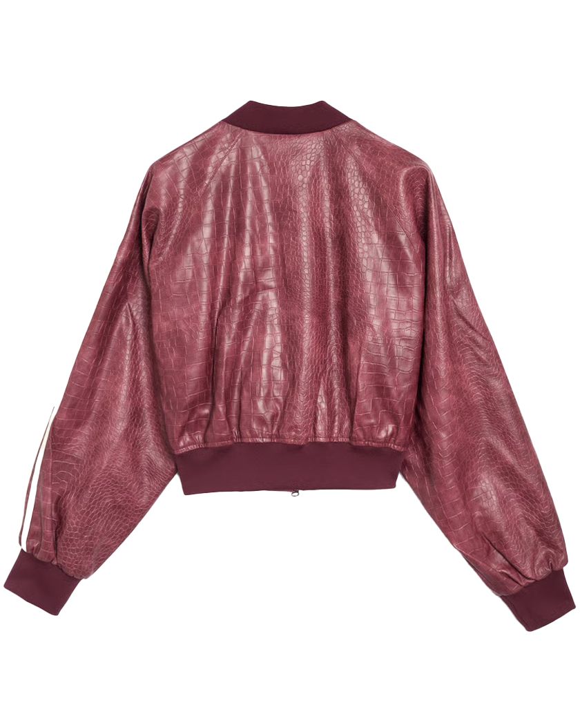 Scopri la giacca bomber Adidas Originals, un capolavoro di stile urbano con un tocco moderno. Caratterizzata da un ricercato design in ecopelle con effetto coccodrillo, questa giacca di colore bordeaux presenta le iconiche strisce bianche lungo le maniche. Un complemento perfetto per gli outfit casual e sportivi.