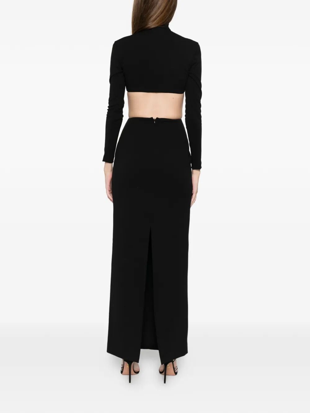 Caratterizzato da un design con collo alto e aperture laterali che enfatizzano la silhouette, questo abito è ideale per momenti speciali. Il materiale in jersey offre comfort e vestibilità eccellente, adattandosi perfettamente al corpo.