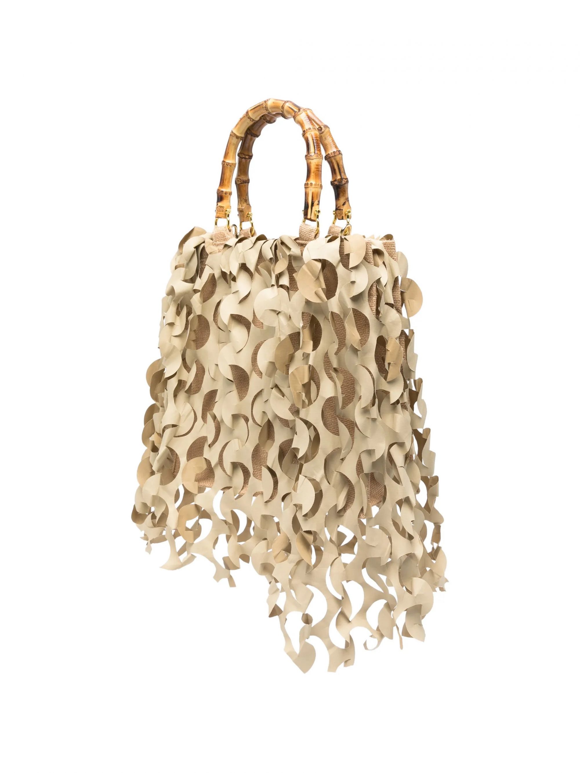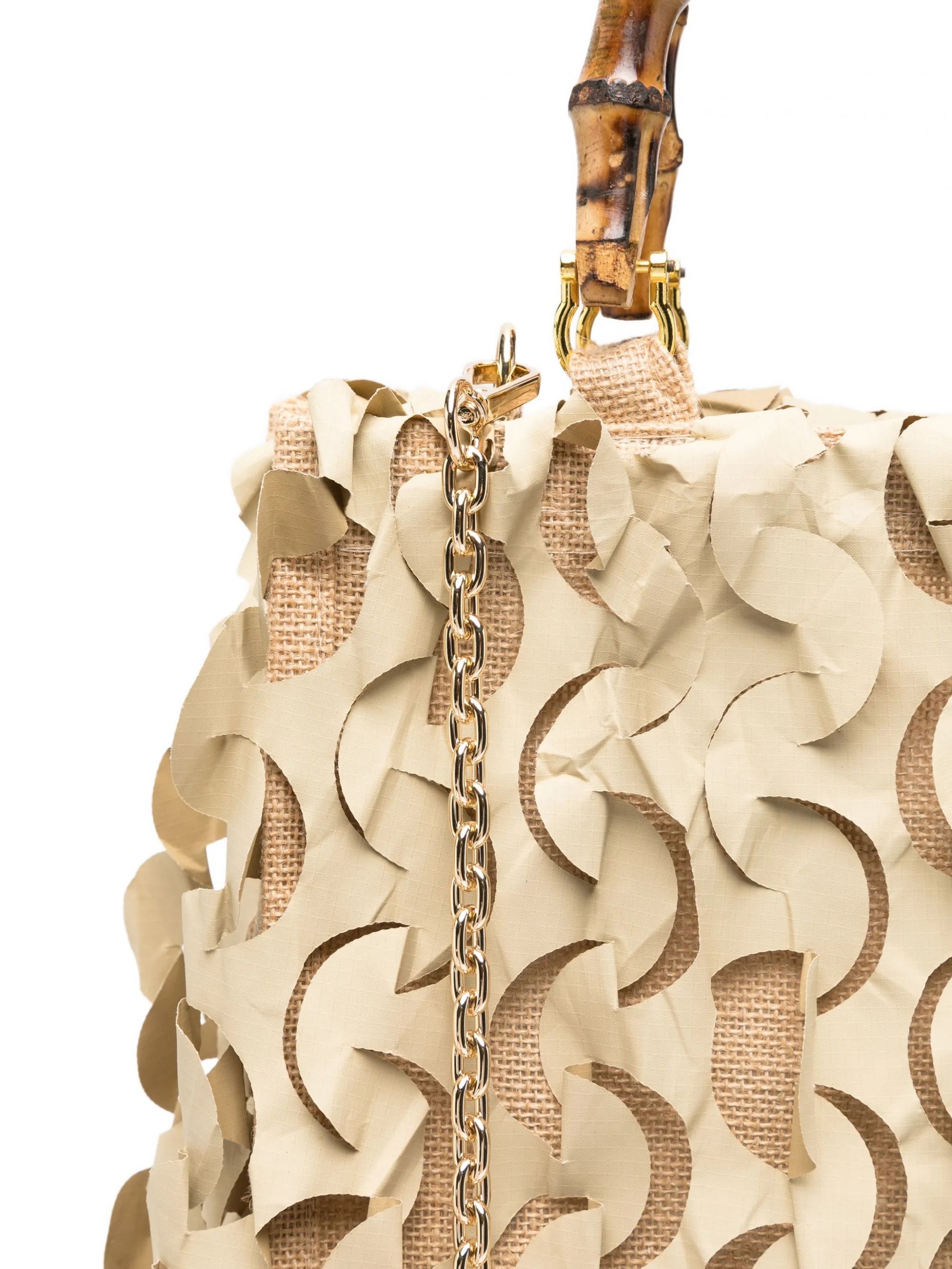 Scopri la borsa a mano unica di LA MILANESA, caratterizzata da un design originale che la rende un vero must-have. Il manico in bamboo aggiunge un tocco naturale ed elegante, mentre la lavorazione artistica del tessuto dona un effetto dinamico e moderno.